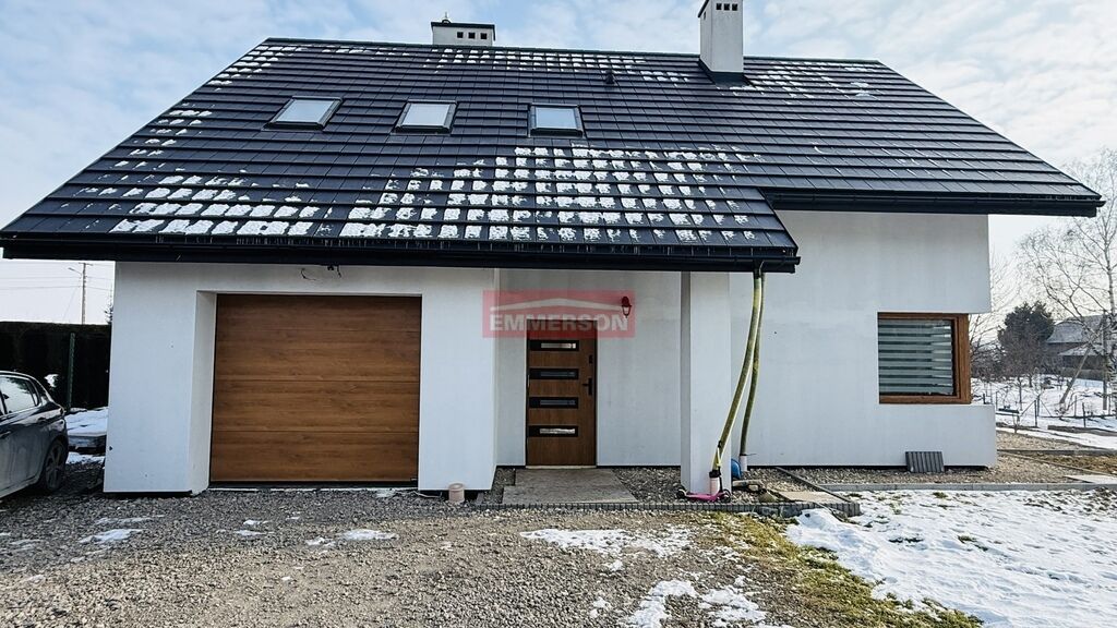 Dom wyróżnia się nowoczesną bryłą i dużymi przeszkleniami,